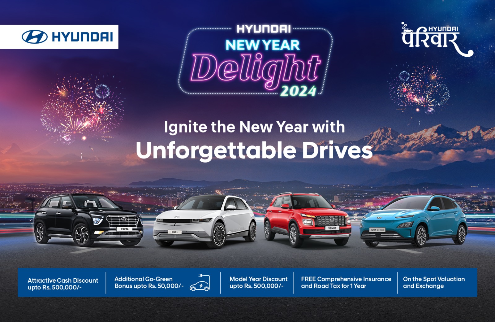 हुन्डाई अटोमोवईल्सको आधिकारीक विक्रेता लक्ष्मी इन्टरकन्टिनेन्टल ले नयाँ वर्षलाई मध्यनजर गर्दै “Hyundai New Year Delight 2024” योजना ग्राहकहरु माझ ल्याएको छ । यो ग्राहकमुखि योजना यही पुष १६, २०८० देखि नेपाल भरिका सबै शोरुममा सुरु भएको छ।