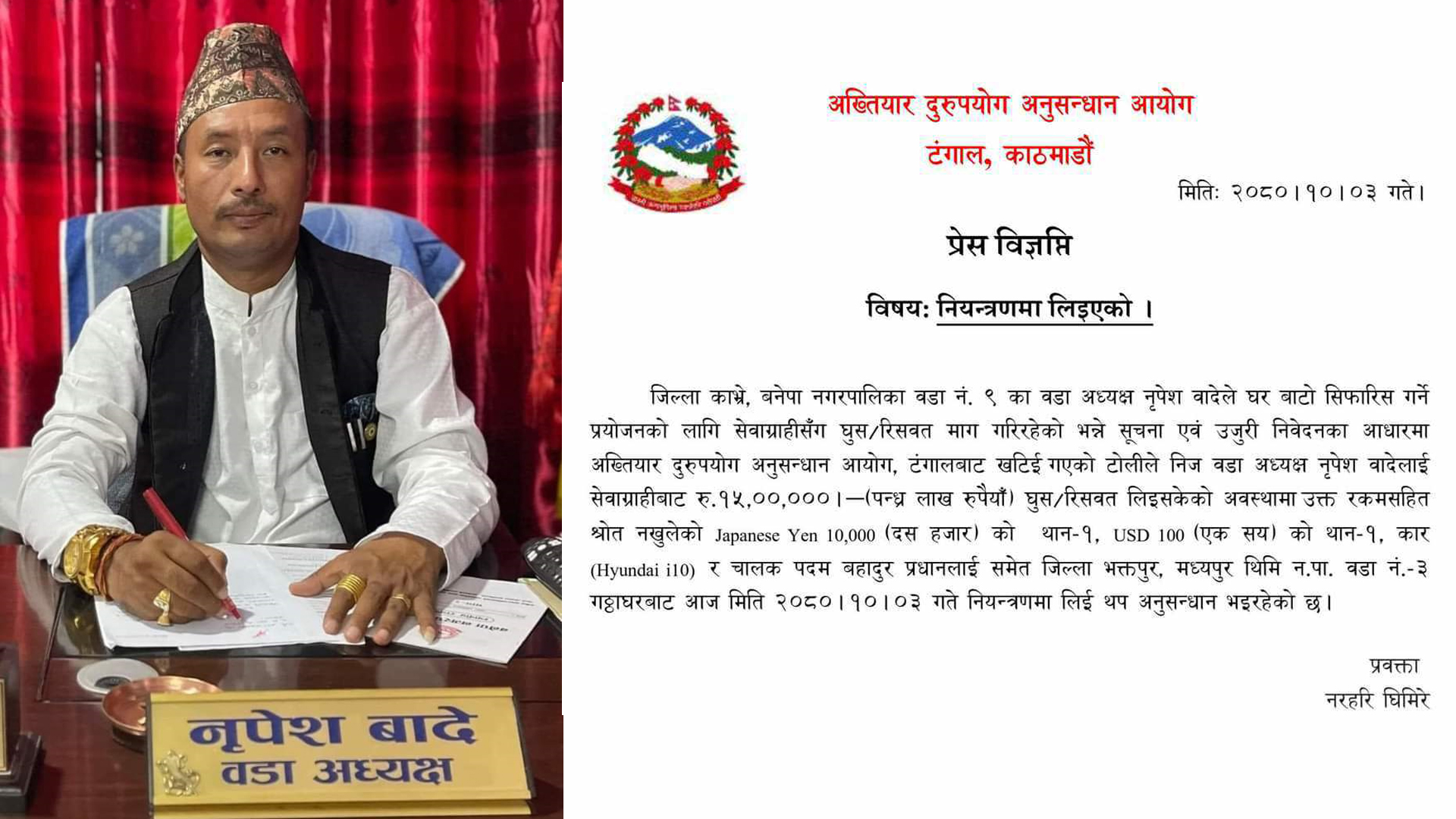 काठमाडौं । अख्तियार दुरुपयोग अनुसन्धान आयोगले सेवाग्राहीबाट घुस लिएको अभियोगमा बनेपा नगरपालिका वडा नं. ९ का वडा अध्यक्ष नृपेश वादेलाई नियन्त्रणमा लिएको छ ।