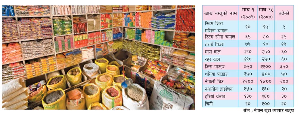 नेपाल खुद्रा व्यापार सङ्घका अनुसार गएको एक वर्षको बिचमा सबैजसो उपभोग्य वस्तुको भाउ औसतमा २० प्रतिशतले महँगिएको छ । सङ्घका अध्यक्ष पवित्र वज्राचार्यले एक वर्षयताका हरेक उपभोग्य वस्तुको मूल्य विश्लेषण गरेर हेर्दा कुनै १० देखि ५० प्रतिशतसम्म महँगिए पनि औसतमा २० प्रतिशत महँगो भएको पाइएको जानकारी दिए ।
