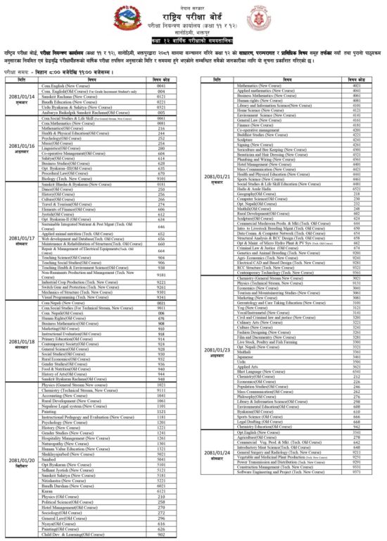 राष्ट्रिय परीक्षा बोर्ड, परीक्षा नियन्त्रण कार्यालय भक्तपुरले सार्वजनिक गरेको तालिकाअनुसार परीक्षा २०८१ वैशाख १४ गतेदेखि सुरु हुनेछ र वैशाख २६ गते समाप्त हुनेछ ।