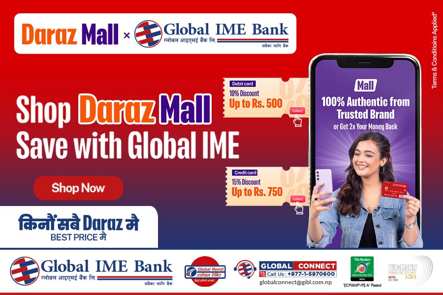 काठमाडौँ । ग्लोबल आइएमई बैंक लिमिटेडका कार्ड बाहक ग्राहकहरुलाई दराज अनलाइनमार्फत सामान किन्दा १५ प्रतिशतसम्म छुट पाउने भएका छन् । छुट योजना फेब्रुअरी ५ देखि अप्रिल ३० सम्म (३ महिना) संचालनमा रहनेछ । बैंकको डेबिट कार्ड प्रयोगकर्ताहरुले १० प्रतिशत वा रु.५०० सम्म र क्रेडिट कार्ड प्रयोगकर्ताहरुले १५ प्रतिशत वा रु.७५० सम्म छुट पाउनेछन् ।