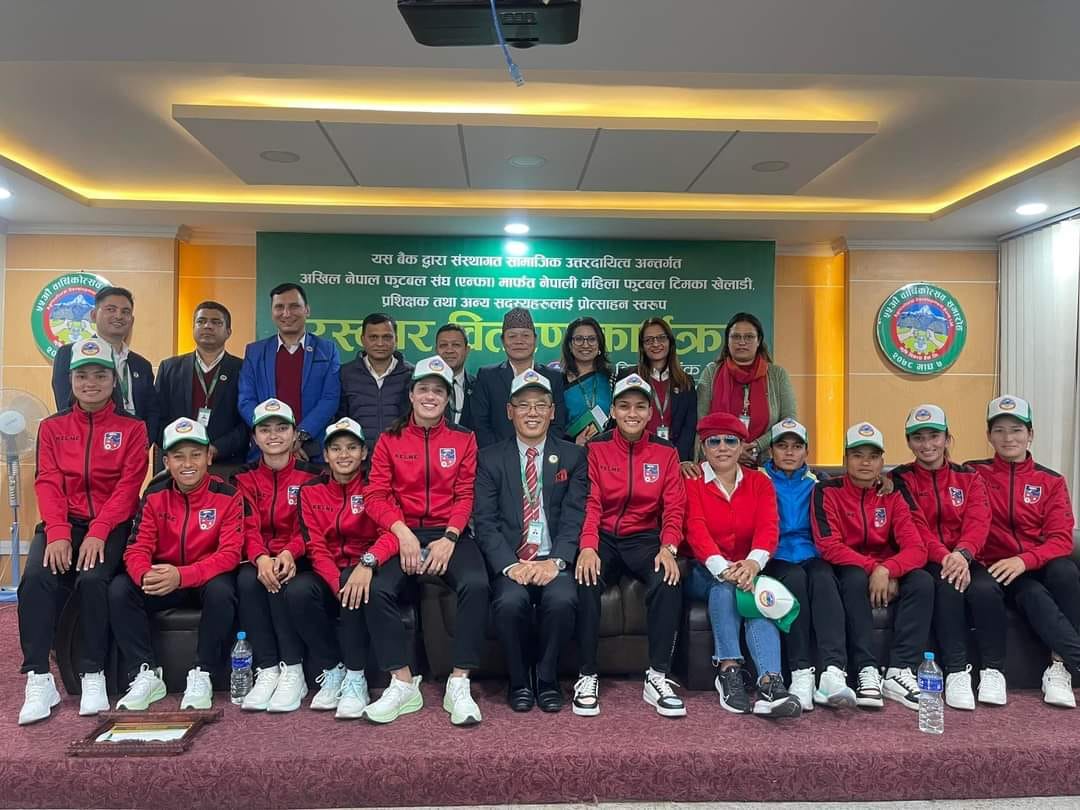 काठमाडौँ । कृषि विकास बैंकले नेपाली महिला फुटवल टिमलाई ६ लाख ७० हजार रुपैयाँ प्रदान गरेको छ । बैंकले नेपाली महिला फुटबल टिमका खेलाडी, प्रशिक्षक तथा अन्य सदस्यहरुलाई प्रोत्साहन स्वरुप उक्त रकम प्रदान गरेको हो । West Asian Football Federation Women’s Championship 2024 प्रतियोगितामा नेपाली महिला फुटवल टिम उपविजेता हुन सफल भएकोमा उक्त रकम बैकले वितरण गरेको हो।