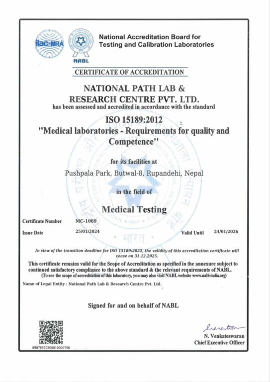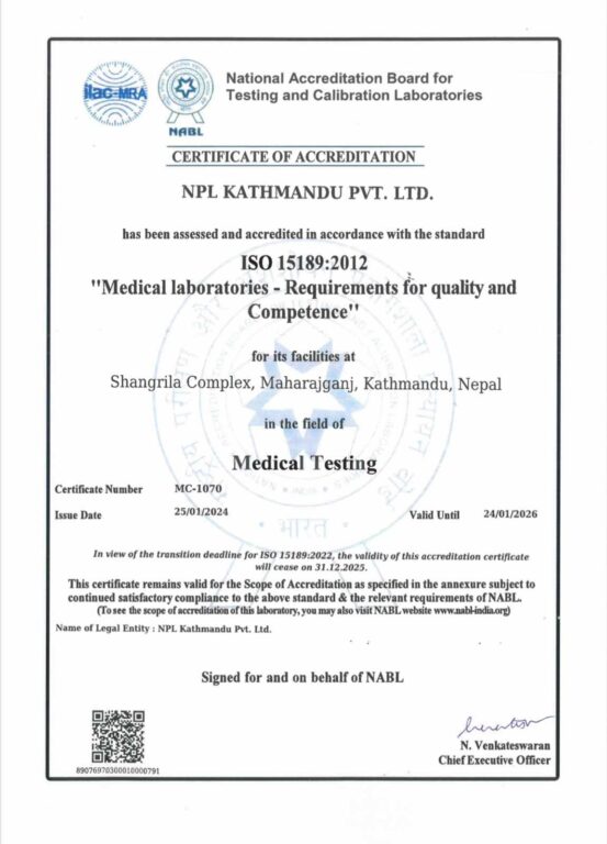 एन.ए.बी.एल.ले आईएसओ १५१८९:२०१२ को अनुसार मेडिकल प्रयोगशाला गुणस्तर र प्रतिस्पर्धता प्रमाणीकरण सेवा प्रदान गर्दछ।