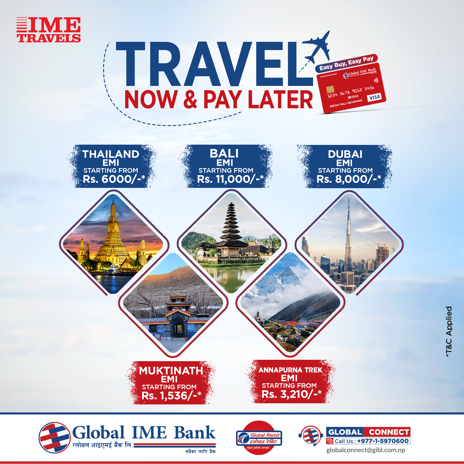बैंकले आन्तरिक भ्रमणका निम्ति न्यूनतम् तीन हजार २१० रुपैयाँ र विदेश भ्रमणको निम्ति ६ हजार रुपैयाँको सरल किस्ताबन्दी योजना ल्याएको हो । क्रेडिट कार्ड हुने ग्राहकले आईएमई ट्राभल्समा गई आफूलाई अनुकूल टूर प्याकेज किस्ताबन्दीमा खरिद गर्न सक्ने बैंकले जनाएको छ । योजनामा आवद्ध भएर क्रेडिट कार्ड लिन चाहने ग्राहकलाई बैंकले कार्डको शुल्कमा ५० प्रतिशत छुट दिने जनाएको छ ।