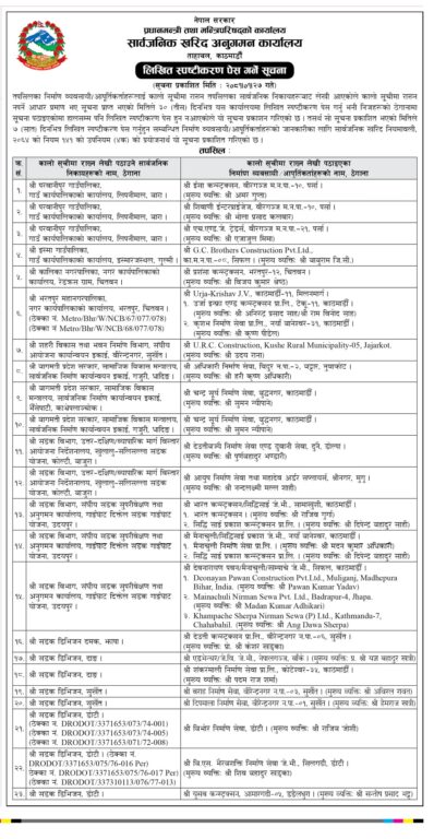 यसरी स्पष्टीकरण सोधिनेमा अधिकांश सडक आयोजना अलपत्र पार्ने ठेकेदार कम्पनी छन् । प्रधानमन्त्री कार्यालयका अनुसार स्पष्टीकरण माग गरिएकामा इसा कन्स्ट्रक्सन, शिवाणी इन्टरप्राइजेज, एच एन्ड जे ट्रेडर्स, जिसी ब्रदर्स कन्स्ट्रक्सन, प्रशंसा कन्स्ट्रक्सन, देवनारायण पवन, मैना चुली र खम्पाचे कन्स्ट्रक्सन रहेका छन् ।