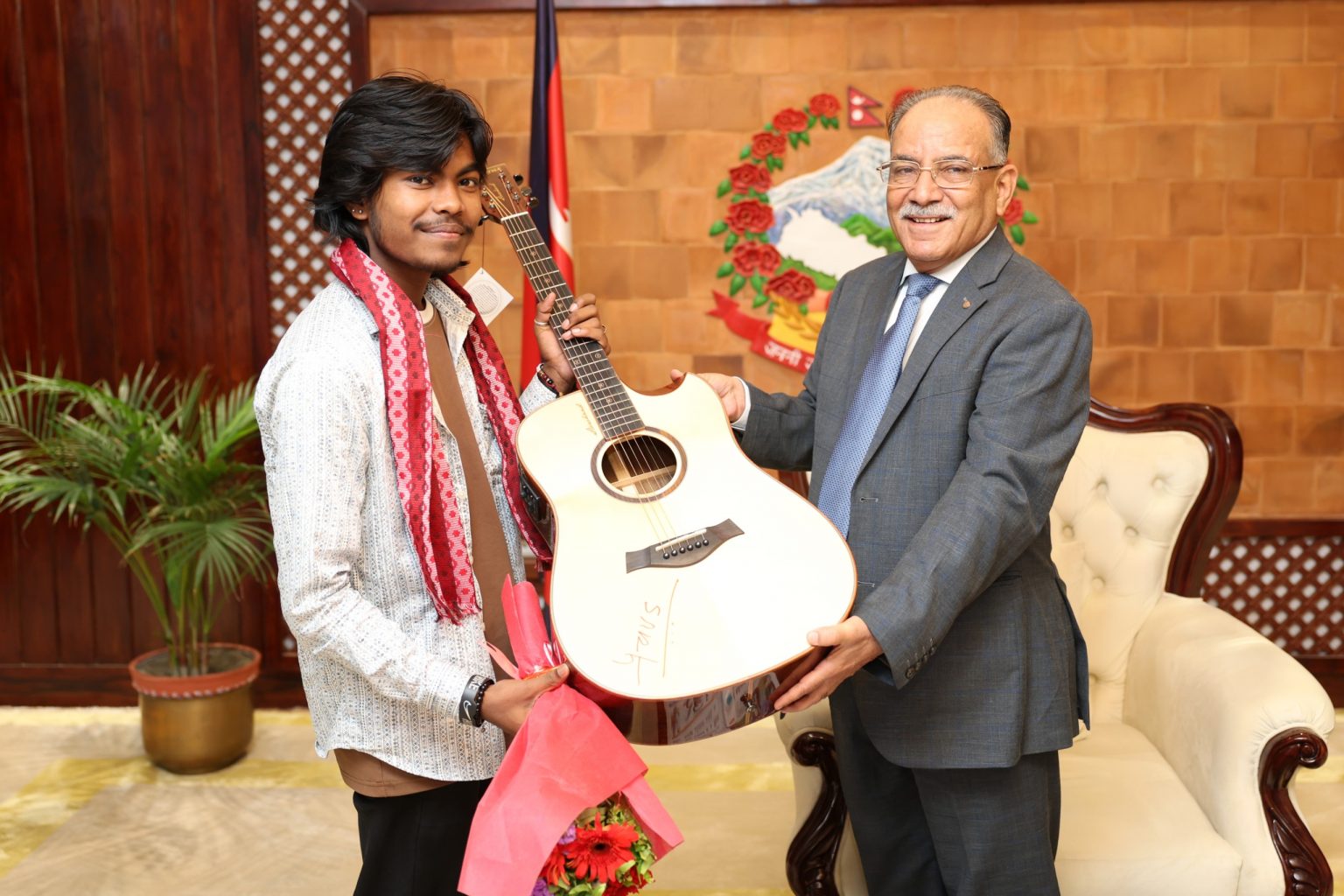 काठमाडौँ । प्रधानमन्त्री पुष्पकमल दाहाल ‘प्रचण्ड’ले नेपाल आइडल विजेता करण परियारलाई आज बिहान प्रधानमन्त्रीनिवास बालुवाटार बोलाएर बधाई दिएका छन् । उक्त अवसरमा उनले विजेता परियारलाई गितार उपहार दिएका थिए ।
