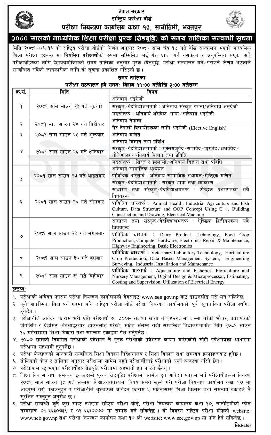 २०८० साल चैत्र १५ गते देखि सञ्चालन भएको माध्यमिक शिक्षा परीक्षा (एसइई) मा नियमित परीक्षार्थीको रूपमा सम्मिलित भई ग्रेड प्राप्त गर्न नसकेका र अनुपस्थित भएका सबै परीक्षार्थीहरूले पूरक परीक्षामा भाग लिन पाउने जनाएको छ ।