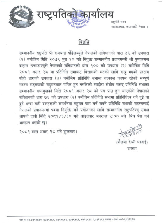 Kathmandu: On Friday, President Ram Chandra Poudel called for the formation of a new government. Issuing a statement today, the President invoked Article 76(2) of the Constitution of Nepal to make this call.