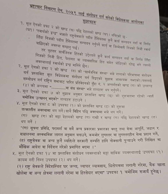 काठमाडौँ । अख्तियार दुरुपयोग अनुसन्धान आयोगले भ्रष्टाचार निवारण ऐन संशोधन विधेयकमाथि १० बुँदे सुझाव दिएको छ । बिहीबार संसदको राज्य व्यवस्था तथा सुशासन समितिको अख्तियार प्रमुख प्रेमकुमार राईले १० बुँदे लिखित सुझाव दिएका हुन् ।