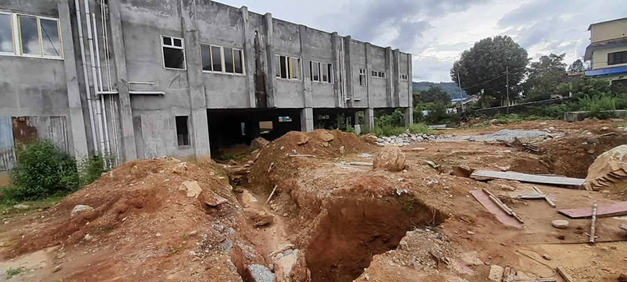 जमिन भासिएपछि पर्वत अस्पतालको निर्माणाधीन भवन ४ वर्षदेखि अलपत्र
