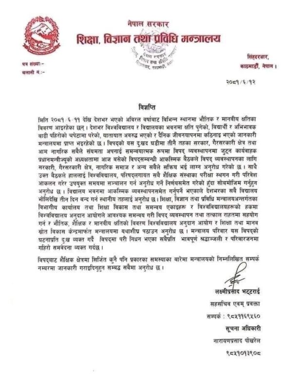 देशभर विश्वविद्यालय र स्कुलका भवनमा क्षति पुगेको, विद्यार्थी र अभिभावक बाढी पहिरोको चपेटामा परेको, यातायात अवरूद्ध भएको र दैनिक जीवनयापनमा कठिनाइ भएको जानकारी मन्त्रालयमा प्राप्त भइरहेकाले यस्तो निर्णय गरिएको मन्त्रालयले शनिबार जारी गरेको विज्ञप्तिमा उल्लेख गरिएको छ ।