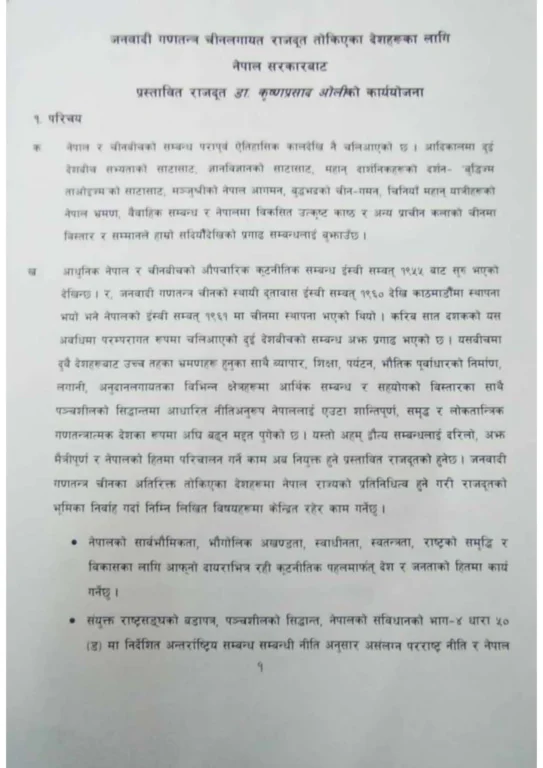 आइतबार बसेको समितिको बैठकमा प्रस्तावित राजदूत ओलीले आफ्नो कार्ययोजना पेस गरेका हुन् । नेपालको स्वाधीनता, राष्ट्रिय सुरक्षा, अक्षुण्णता, दिगो शान्तिका लागि कूटनीतिक सम्बन्धलाई सुदृढ गर्ने, राष्ट्रिय स्वार्थलाई सर्वोपरि राखेर अन्तर्राष्ट्रिय सम्बन्ध विस्तारमा सहयोग र सहकार्य अघि बढाउने लगायतका उनको कार्ययोजनामा उल्लेख छ ।