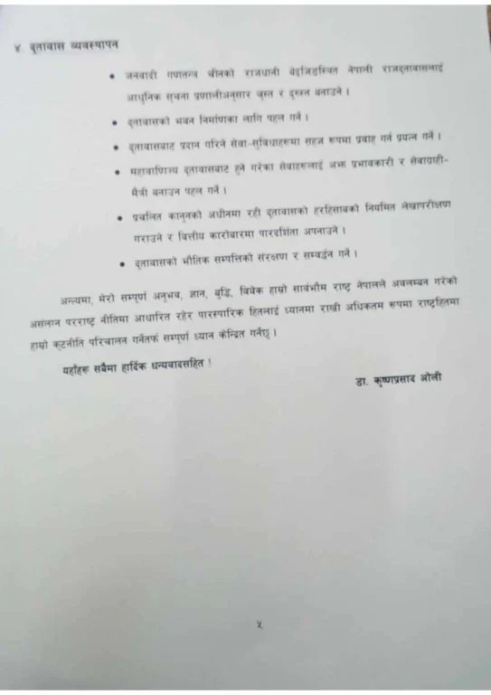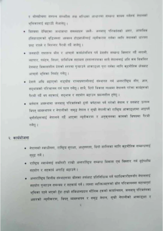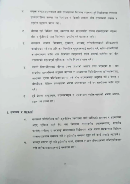 यसैगरी अन्तर्राष्ट्रिय वित्तीय संस्थाहरूमा चीनका तर्फबाट प्रतिनिधित्व गर्ने पदाधिकारीहरूसँग नेपाललाई सहयोग पुर्याउन समन्वय र सहकार्य गर्ने पनि उनको कार्ययोजनामा उल्लेख छ । त्यस्तै चीन सरकारले अगाडि सारेको परियोजना बेल्ट एन्ड रोड इनिसियटिभ ९बीआरआई० बारे सरकारले लिने नीति कार्यान्वयन गर्ने उल्लेख गरेका छन् ।