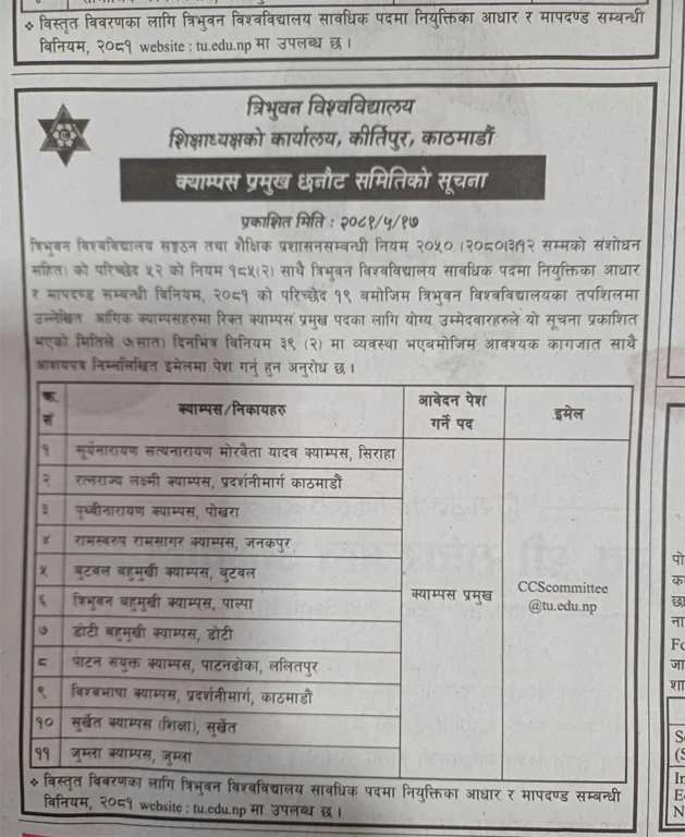 त्यसैगरी रामस्वरुप रामसागर क्याम्पस जनकपुर, त्रिभुवन बहुमुखी क्याम्पस पाल्पा, डोटी बहुमुखी क्याम्पस र जुम्ला क्याम्पसका लागि पनि प्रतिस्पर्धाबाट क्याम्पस प्रमुख नियुक्त गर्न चाहेको त्रिविले जनाएको छ । योग्यता पुगेका इच्छुकलेसात दिनभित्र आवेदन दिन सकिने सूचनामा उल्लेख छ ।