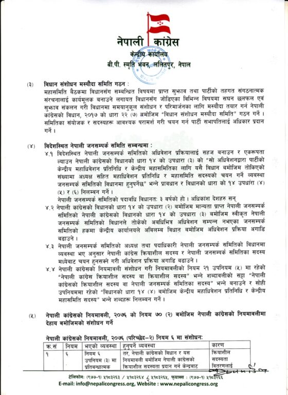 काठमाडौं । नेपाली कांग्रेसले महासमिति बैठकमा पेस भएका सबै प्रतिवेदनहरू संशोधनसहित पारित गरेको छ । आइतबार सम्पन्न केन्द्रीय कार्यसमितिको बैठकको उपसभापति पूर्णबहादुर खड्काले पेस गरेको प्रतिवेदन र महामन्त्रीद्वय गगन थापा र विश्वप्रकाश शर्माले पेस गरेको प्रतिवेदनमा परिमार्जन गरी पारित गरेको हो ।