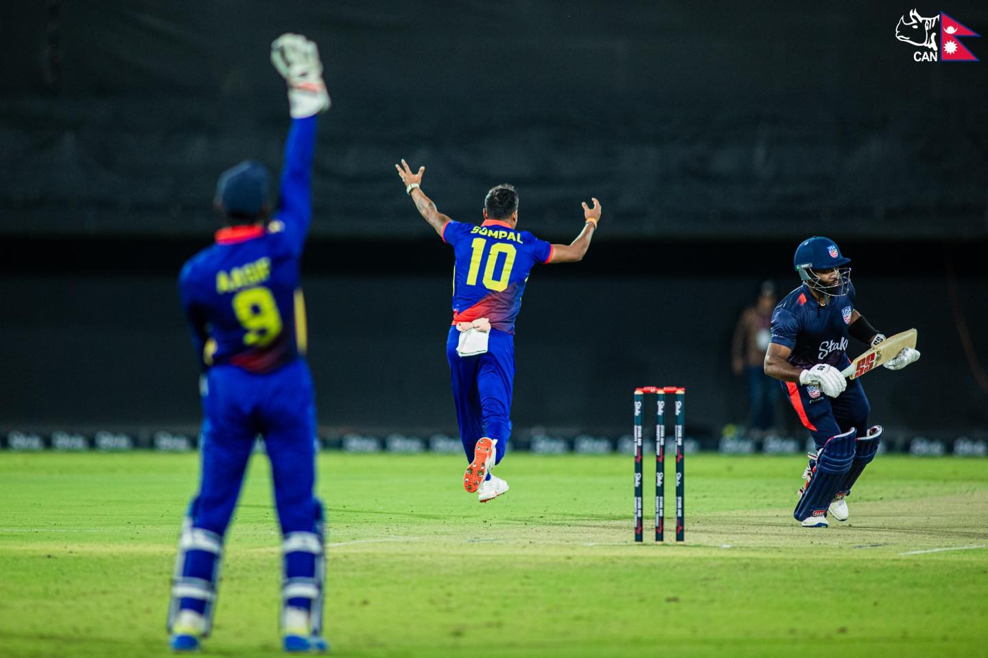 यसअघि डालासमा टस जितेर ब्याटिङ गरेको नेपालले २० ओभरमा ६ विकेट गुमाएर १ सय ७० रन बनायो । नेपालका कुशल भुर्तेलले नटआउट ९२ रन बनाए । भुर्तेलले ५४ बल खेल्दै ६ छक्का र ७ चौका प्रहार गरे । अमेरिकाका जसदीप सिंह र नोस्थुश केन्जिगेले समान २ विकेट लिए ।
