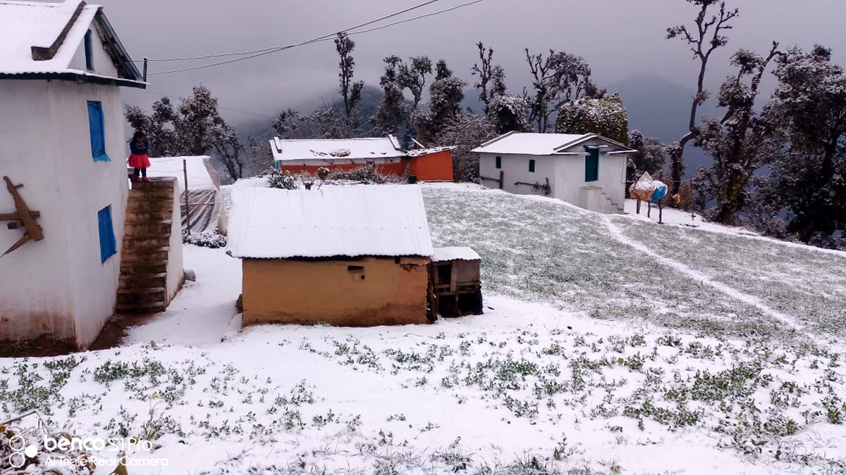 डोटी । सुदूरपश्चिम प्रदेशको पहाडी जिल्ला डोटीमा गएरातिदेखी हिमपात शुरु भएको छ । हिमपातका कारण यहाँको जनजीवन प्रभावित भएको छ । हिमपातसँगै भारी वर्षाका कारण डोटीका लेकाली बस्ती हिउँले सेताम्य भएका छन् ।