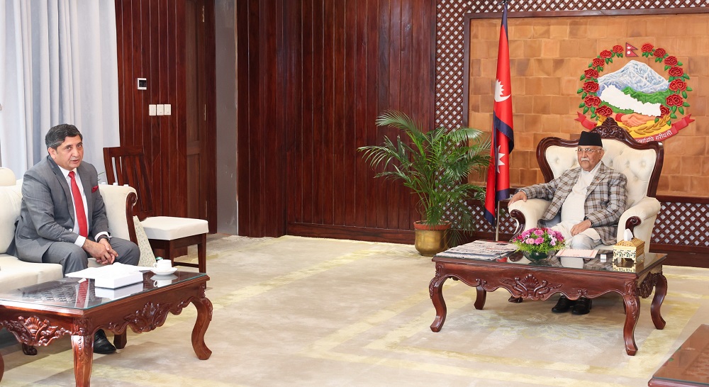 काठमाडौं । प्रधानमन्त्री केपी शर्मा ओलीसँग नेपालका लागि पाकिस्तानका राजदूत एब्रार एच हस्मीले मङ्गलबार शिष्टाचार भेट गरेका छन् । प्रधानमन्त्री निवास, बालुवाटारमा भएको भेटमा दुुईपक्षीय सम्बन्ध र हितका विविधि विषयहरु व्यापार, पर्यटन, कृषि, नवीकरणीय ऊर्जा, विपद् व्यवस्थापन, शिक्षा र संस्कृति आदिमा हुँदै आएको सहयोग आदानप्रदानलाई अभिवृद्धि गर्ने विषयमा छलफल भएको प्रधानमन्त्रीको सचिवालयले जनाएको छ ।