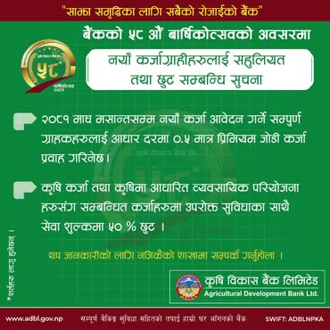 काठमाडौँ । कृषि बिकास बैंकले आफ्नो ५८ औँ बार्षिकत्सवको अवसरमा सेवा तथा ब्याज शुल्कमा छुट दिने भएको छ । बैैंकले बार्षिकत्सवको अबसरमा नयाँ कर्जाग्राहकलाई सहुलियत तथा छुट योजना सार्वजनिक गरेको हो । सीमित अवधिको लागि तय भएको छुट योजनामा सबैप्रकारको कर्जाको आधार दरमा ०.५ प्रतिशत मात्र प्रिमियम जोडिने जनाइएको छ । त्यस्तै कृषि कर्जा तथा कृषिमा आधारित ब्यवसायिक परियोजनाहरुको सेवा शुल्कमा ५० प्रतिशत छुट हुने ब्यवस्था गरिएको छ ।