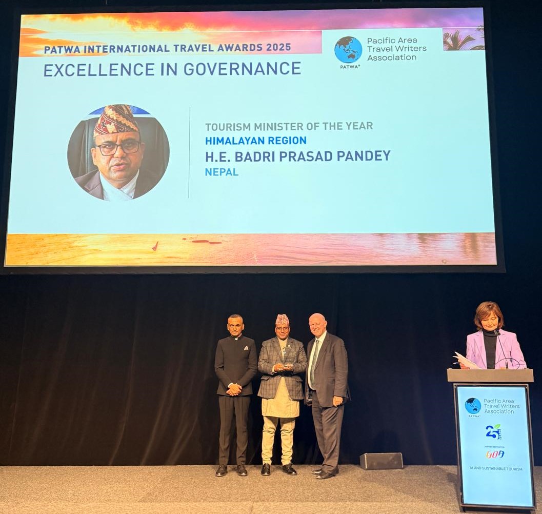 बर्लिनमा प्यासिफिक एसिया ट्राभल राइटर्स एसोसिएसन (पाटवा) ले आयोजना गरेको ‘वल्र्ड टुरिजम एन्ड एभिएसन समिट–२०२५’ का अवसरमा मन्त्री पाण्डेलाई हिमालय क्षेत्रका मुलुकहरूबाट वर्षको उत्कृष्ट पर्यटनमन्त्रीका रूपमा अवार्ड प्रदान गरिएको नेपाल पर्यटन बोर्डले विज्ञप्तिमार्फत जनाएको छ ।