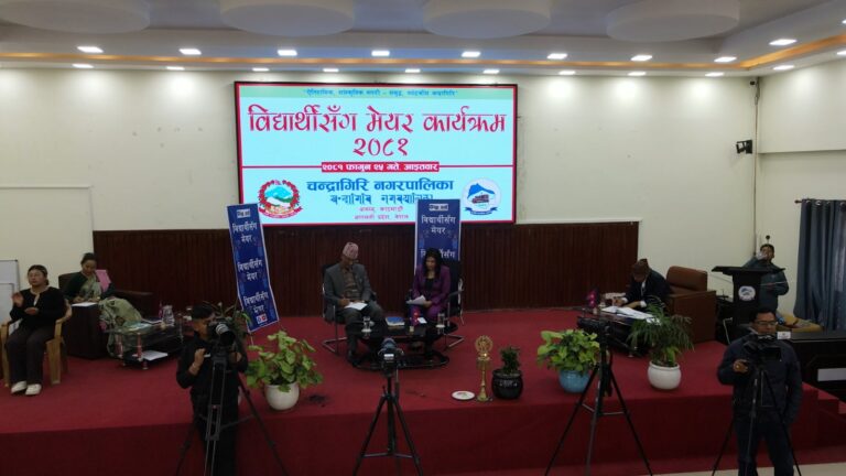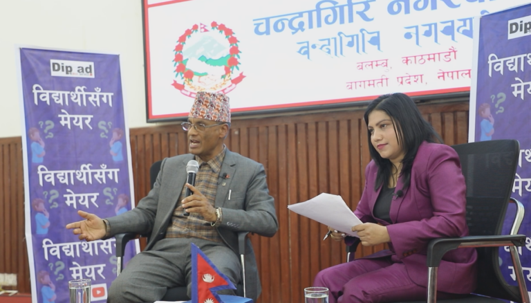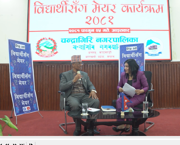काठमाडौँ । चन्द्रागिरि नगरपालिकाले विद्यार्थीसँग मेयर कार्यक्रम सम्पन्न गरेको छ । नगरपालिका र दिप एड मिडिया सर्भिसको संयुक्त आयोजना सम्पन्न भएको उक्त कार्यक्रमअन्तर्गत स्थानीय सरकार र जनप्रतिनिधिसँग विद्यार्थीको धारणा, अपेक्षा, समस्याहरु पहिचान गर्न उक्त कार्यक्रमको आयोजना गरिएको हो । नगरपालिकाको सभाहलमा आयोजना गरिएको उक्त कार्यक्रममा नगरप्रमुख, उप-प्रमुख,शिक्षा बिभागका निर्देशक, शाखा अधिकृत, कार्यपालिका सदस्य, वडा अध्यक्ष, शिक्षक, बिद्यार्थी, अभिभावक र अन्य सहभागी गरि १ सय जना भन्दा बढीको सहभागिता रहेको थियो । नगरपालिका भित्र रहेको २४ सामुदायिक र ८० संस्थागत बिद्यालयका झण्डै साढे ३५ हजार बिद्यार्थीको प्रतिनिधित्व गर्दै आएको ७० भन्दा बिद्यार्थीहरुले नगरप्रमुख घनश्याम गिरि समक्ष आफुले भोगेका समस्यादेखी जनजिविकाको सवालमा प्रश्न गरेका थिए ।