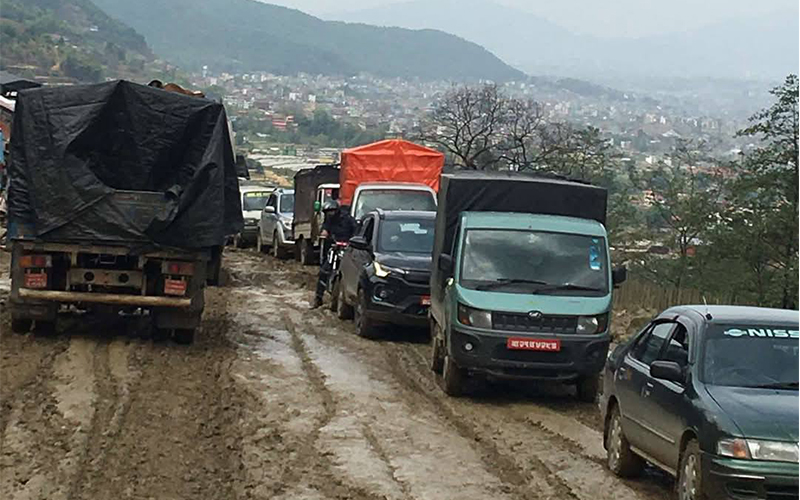 भक्तपुर । गएरातिदेखिको वर्षाले अरनिको राजमार्गअन्तर्गत भक्तपुरको सूर्यविनायक–जगाति सडकमा आवत जावत गर्न समस्या भएको छ । जिल्ला ट्राफिक प्रहरी परिसर भक्तपुरका प्रमुख एवं प्रहरी निरीक्षक प्रदीप खत्रीले वर्षाका कारण भक्तपुरको सूर्यविनायक–जगाति हुँदै काभ्रेपलाञ्चोक जाने निर्माणाधीन सडक एकतर्फी रूपमा सञ्चालन गरिएको जानकारी दिए ।