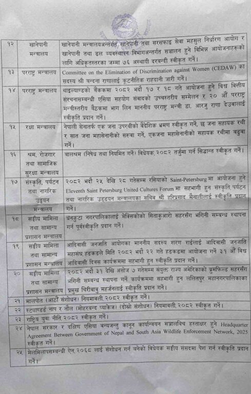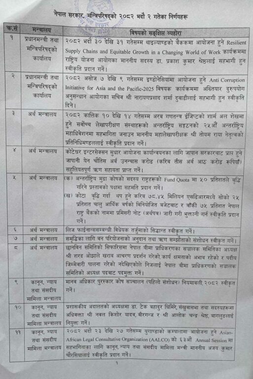 काठमाडौँ । सरकारले मन्त्रिपरिषद् बैठकका निर्णय सार्वजनिक गरेको छ । भदौ २ गते बसेको मन्त्रिपरिषद्का बैठकका निर्णय सरकारका प्रवक्ता एवम् सञ्चार तथा सूचना प्रविधिमन्त्री पृथ्वी सुब्बा गुरुङले बुधबार सार्वजनिक गरे।