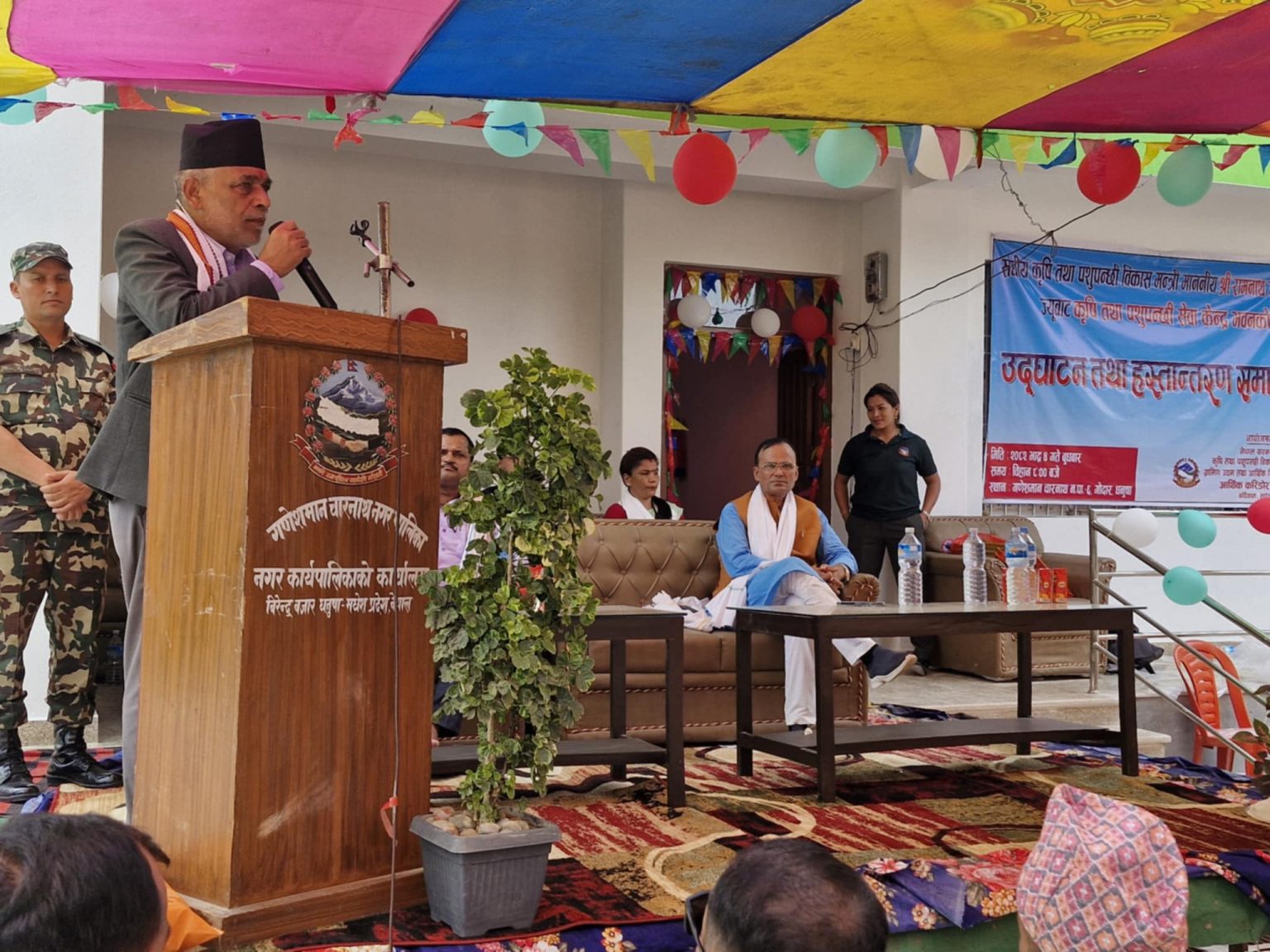 कृषि तथा पशुपन्छी विकास मन्त्रालय अन्तर्गतको ग्रामीण उधम तथा आर्थिक विकास आयोजना ले निर्माण गरेको उक्त भवन नगरपालिकालाई हस्तान्तरण गरिएको छ । कार्यक्रममा मन्त्री अधिकारीले किसानले आफ्नै घरमा सेवा पाउने गरी सरकारले काम गरिरहेको बताए । हाम्रै गाउँ घरमा किसानलाई आवश्यक सल्लाह , कृषि बाली र पशुपन्छीमा लागेका रोग र समस्याको निधान गर्न आवश्यक छ , मन्त्री अधिकारीले भने । मन्त्री अधिकारीले मन्त्रालयले आफ्ना विभिन्न निकाय मार्फत आम किसानको घर दैलोमै सेवा दिन आइरहेकाले किसानलाई यसको लाभ लिन आग्रह गरे ।