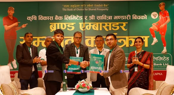 काठमाडौँ । राष्ट्रिय महिला फूटबल टोलीकी कप्तान सावित्रा भण्डारीलाई कृषि विकास बैंक लिमिटेडले पुन ब्रान्ड एम्बेसडरमा नियुक्ति गरेको छ। शुक्रबार साझ एक कार्यक्रमको आयोजना गरि साम्बालाई पुन एक वर्ष अवधिका लागि सद्भावनादूत नियुक्त गरेको हो। सम्झौता पत्रमा बैंकका उप-महाप्रबन्धक सुदिप कुमार दाहाल र साम्बाले हस्ताक्षर गरेका थिए । बैकका कार्यकारी अधिकृत गोबिन्द गुरुङले बैंकका सेवा तथा सुबिधाहरु आजजनतामा पुर्याउन तथा बैंकलाई अन्तर्राष्ट्रिय स्तरमा चिनाउन पनि अन्तर्राष्ट्रिय ख्यातीपप्राप्त खेलाडीलाई ब्रान्ड एम्बेसडरमा पुन सम्झौता गरेको बताउनुभयो ।