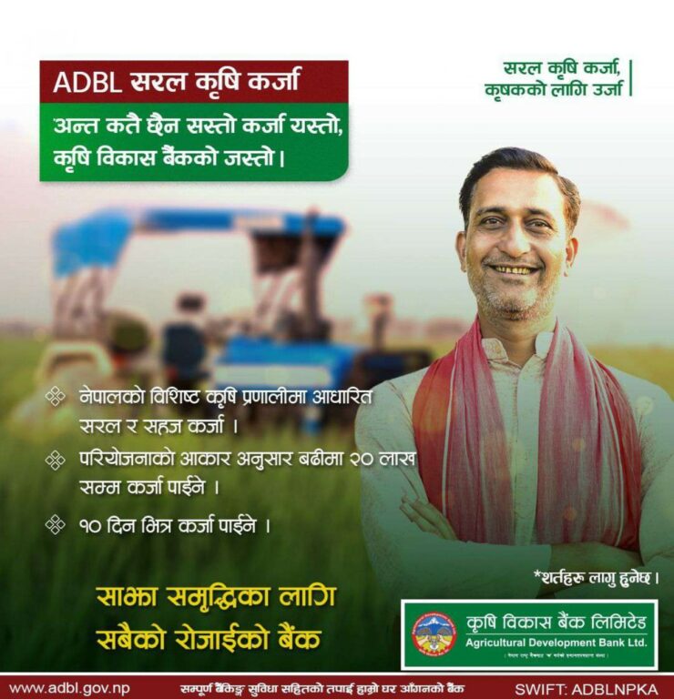 काठमाडौँ । कृषि विकास बैंक लि. ले कृषि कर्जाको व्याजदर घटाएको छ । कार्तिक १ गते देखि लागुहुने गरी कृषि पेशा /व्यवसायमा आवद्ध ग्राहकहरुलाई लक्षित गर्दै कृषि विकास बैंक लि.ले कृषि कर्जाको व्याजदर प्रिमियममा ०.५ प्रतिशत घटाएको हो । यो व्याजदर प्रिमियम बैंकबाट प्रदान गरिने अन्य कर्जाहरु भन्दा ०.५ प्रतिशत कम हुने बैंकले दाबी गरेको छ । अब कृषि विकास बैंकले प्रदान गर्ने कृषि कर्जाको ब्याजदरमा बेसरेटमा थप १ प्रतिशत मात्र प्रिमियम थप गरि ब्याजदर कायम हुने बैकले जनाएको छ ।ब्याजदर घटेसँगै ब्यवसायिक कृषकले यो सेवाबाट लाभ लिने अपेक्षा गरिएको छ । यो सगैँ ब्यवसायिक कृषि पेशामा आर्कषण बढ्ने अपेक्षा गरिएको छ । विगत ५८ वर्ष देखी कृषि पेशामा योगदान पुर्याउदै आएको यस बैंकले प्रवाहा गरेको कर्जा मध्ये ३३ प्रतिशत कृषि क्षेत्रमा समेटिको छ । बैंकले हालसम्म ८०००० कृषक तथा कृषि व्यवसायीहरुलाई कर्जा प्रदान गर्दै आईरहेको दाबी गरेको छ । यसैबीच कात्तिक महिनाका लागि १४ वटा वाणिज्य बैंकले व्यक्तिगत मुद्दती निक्षेपको ब्याजदर असोजको तुलनामा घटाएका छन्।