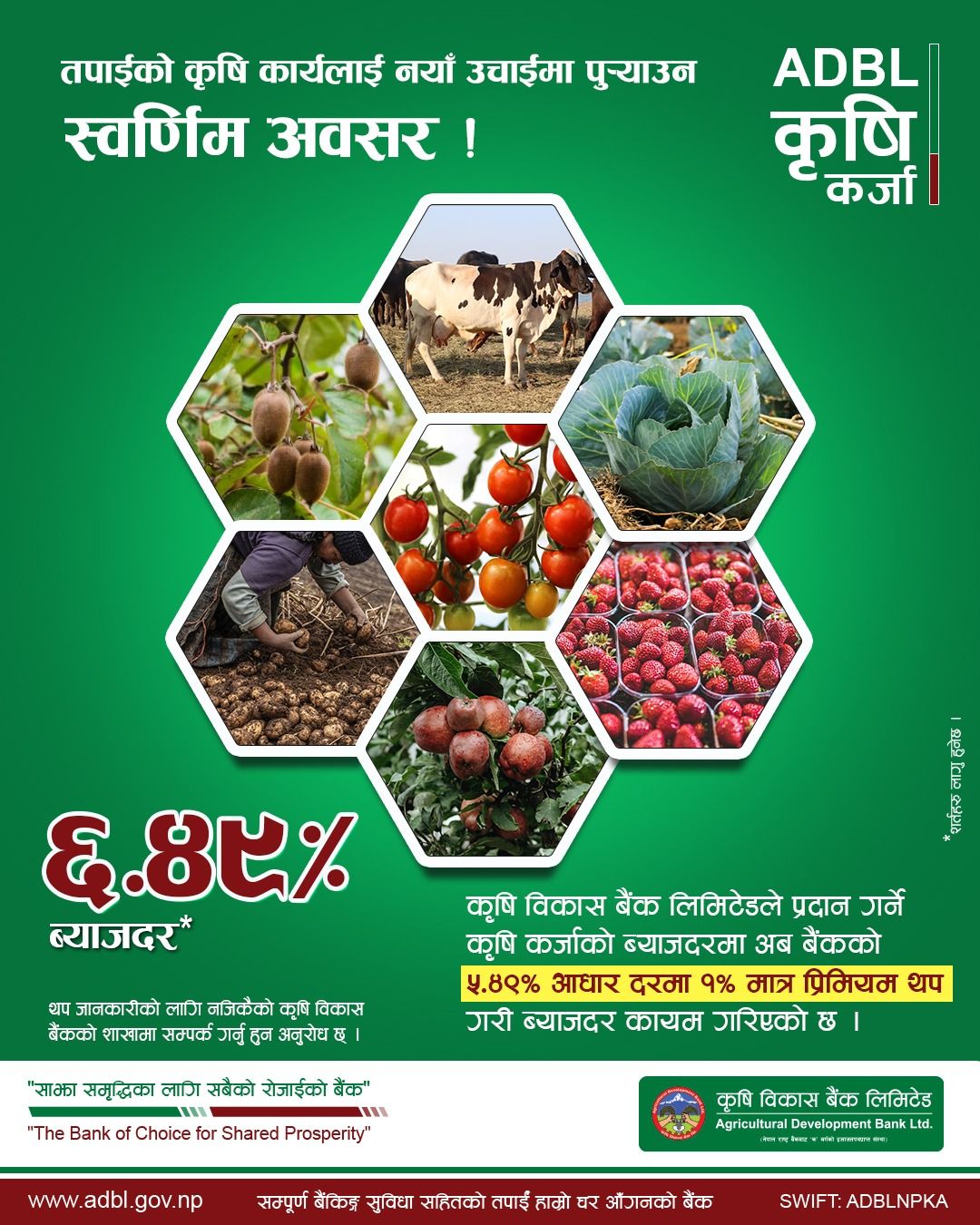 काठमाडौँ । कृषि बिकास बैंकले कृषि कर्जा ब्याजदर घटाएसँगै कर्जाको सुबिधा लिन आह्वान गरेको छ । बैंकले ब्यवसायिक कृषकहरुलाई लागि ६.४९ % ब्याजदरमा कृषि कर्जा उपलब्ध गराएको छ । जसमा ५.४९ बेस दर र १ प्रतिशत प्रिमियम जोडीएको हो । बैंकले कृषकहरुलाई यो सेवाबाट लाभ लिन आह्वान गरेको छ । बैंकले कार्तिक १ गते देखि लागुहुने गरी कृषि पेशा र व्यवसायमा आवद्ध ग्राहकहरुलाई लक्षित गर्दै कृषि कर्जाको व्याजदर घटाएको हो । यो सगैँ ब्यवसायिक कृषि पेशामा आर्कषण बढ्ने अपेक्षा गरिएको छ । विगत ५८ वर्ष देखी कृषि पेशामा योगदान पुर्याउदै आएको यस बैंकले प्रवाहा गरेको कर्जा मध्ये ३३ प्रतिशत कृषि क्षेत्रमा समेटिको छ । बैंकले हालसम्म ८०००० कृषक तथा कृषि व्यवसायीहरुलाई कर्जा प्रदान गर्दै आईरहेको दाबी गरेको छ ।