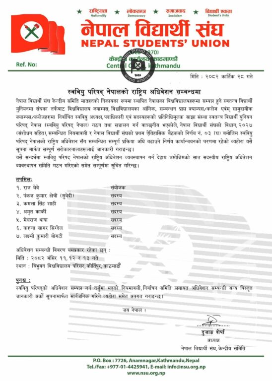 नेविसंघले परिषद्को अधिवेशन मिति पनि तय गरेको छ । यसै सालको मंसिर ११, १२ र १३ गते त्रिभुवन विश्वविद्यालय परिसरमा अधिवेशन हुनेछ ।