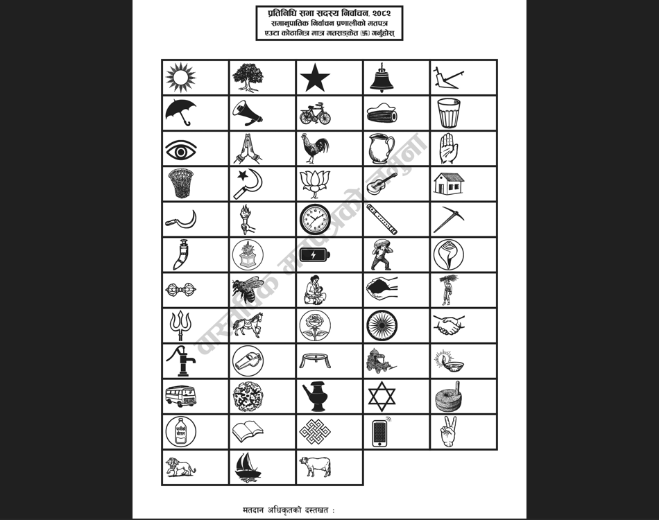 काठमाडौँ । निर्वाचन आयोगले आगामी फागुन २१ गते हुने प्रतिनिधिसभा सदस्य निर्वाचनका लागि विभिन्न जिल्ला र निर्वाचन क्षेत्रको मतपत्रको नमुना सार्वजनिक गरेको छ ।