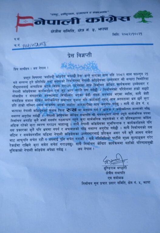 पार्टीले आम मतदाताहरूलाई कांग्रेसको चुनाव चिन्ह रूखमा मतदान गर्न र भ्रामक हल्लाको पछि नलाग्न आग्रह गरेको छ।