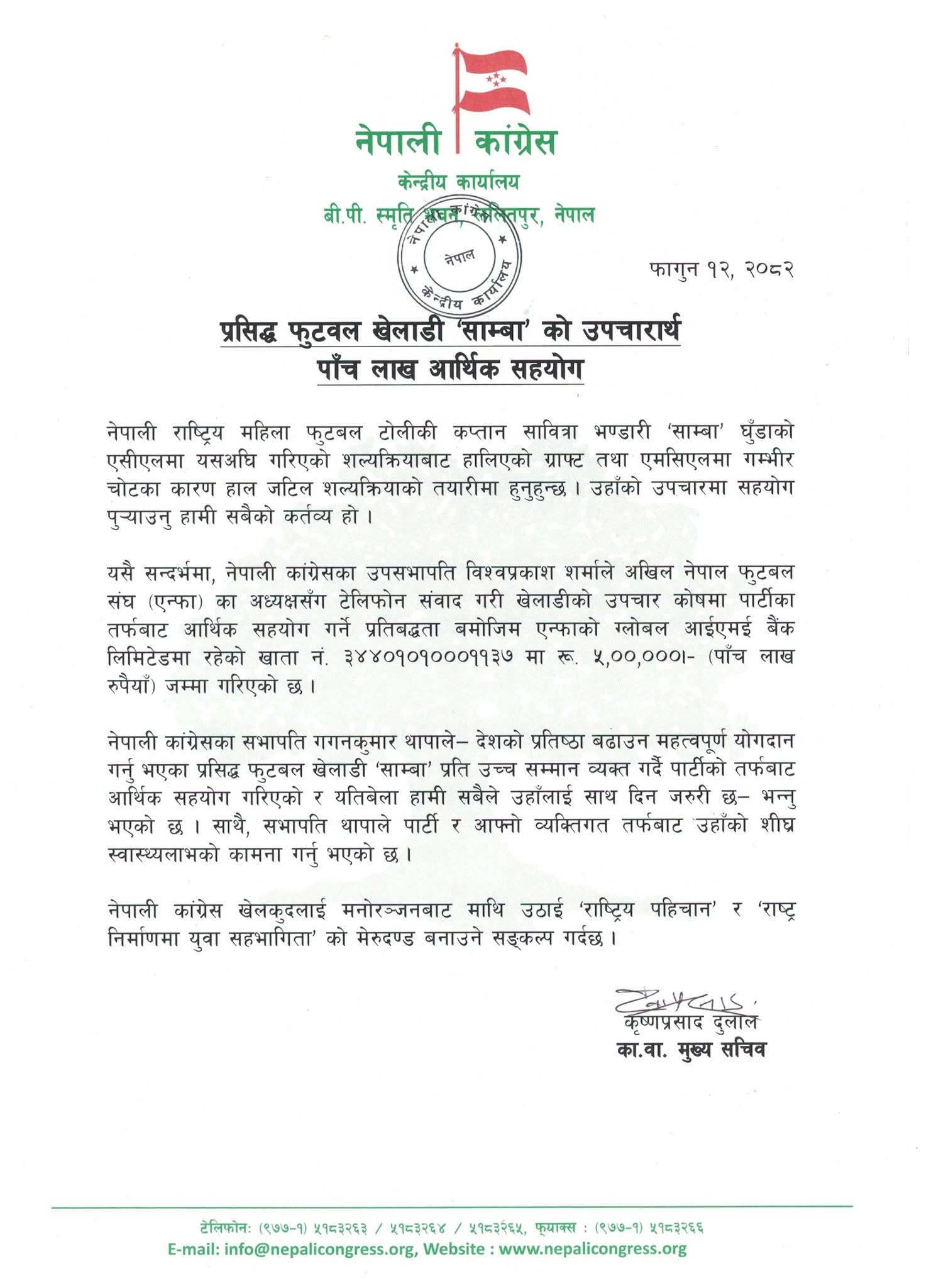 पार्टीका उपसभापति विश्वप्रकाश शर्मा ले अखिल नेपाल फुटबल संघ (एन्फा) का अध्यक्षसँग संवाद गरी खेलाडीको उपचार कोषमा पार्टीको तर्फबाट रकम जम्मा गर्ने प्रतिबद्धता व्यक्त गरेका थिए। सो रकम एन्फाको ग्लोबल आईएमई बैंक लिमिटेड मा रहेको खाता नम्बर ३४४०१०१०००११३७ मा जम्मा गरिएको छ।